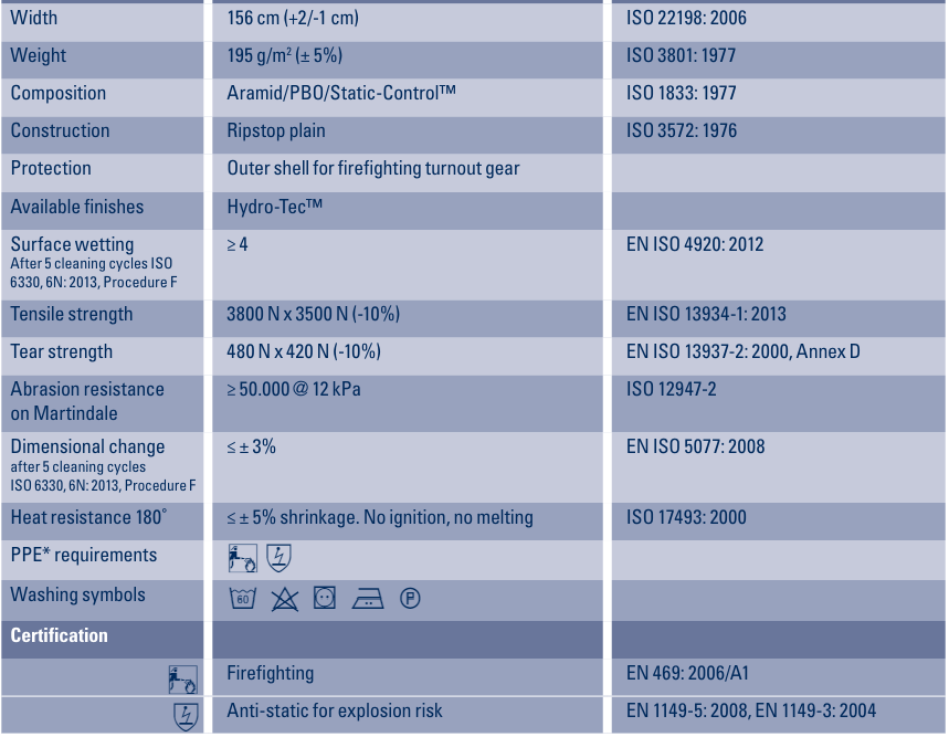 Stofsamenstelling: 59% para-aramide/ 39% PBO/ 2% Static-Control, inherent vlamvertragend, zeer hoge scheursterkte