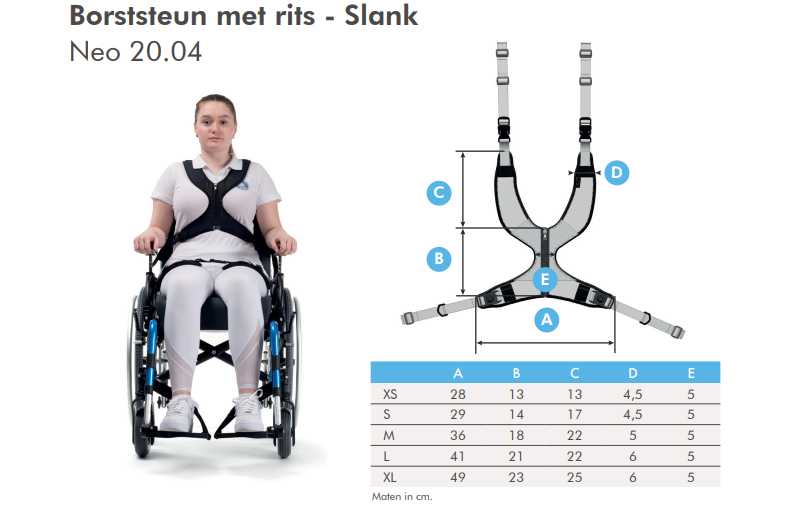 Voor een optimale werking is de juiste maat essentieel. Raadpleeg de Neoflex-catalogus voor een uitgebreide maattabel en kies de borststeun die perfect aansluit bij de gebruiker.