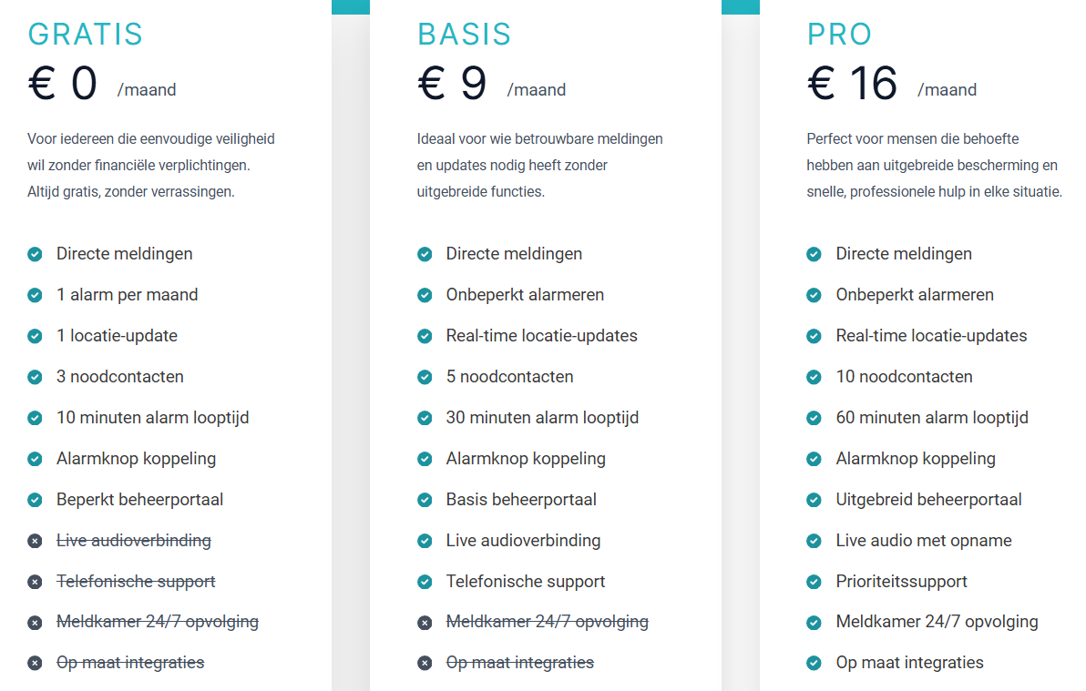 - Zorgverleners: alarmknop (met polsband en/of flexiclip) + gratis app + evt abonnement naar keuze (niet verplicht)