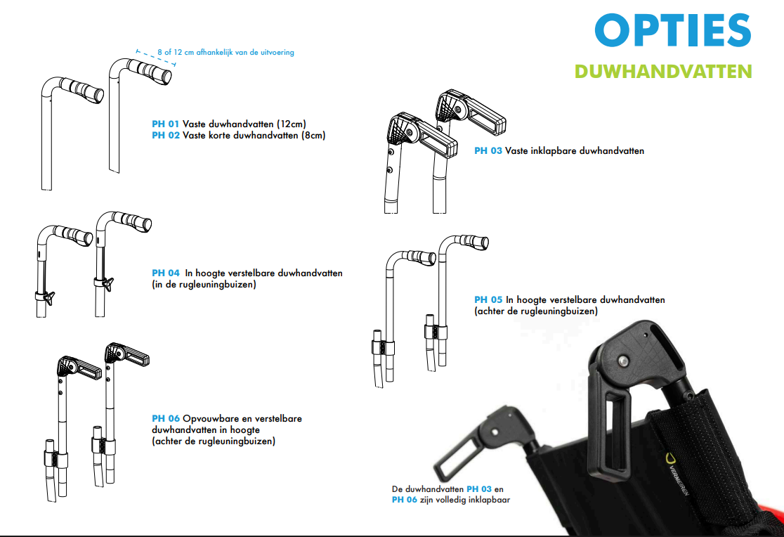 | Type Duwhandvaten Trigo | No PH: Geen duwhandvatten or PH01: Vaste duwhandvatten (12 cm) or PH02: Vast duwhandvatten - kort (8cm) or PH03: Plooibare duwhandvatten or PH04: In hoogte verstelbare duwers - bevestigd in de rugbuizen - vaste duwhandvatten or PH05: In hoogte verstelbare duwers - met haken achter de rugbuis - vaste duwhandvatten or PH06: In hoogte verstelbare duwers - met haken achter de rugbuis - plooibare duwhandvatten |