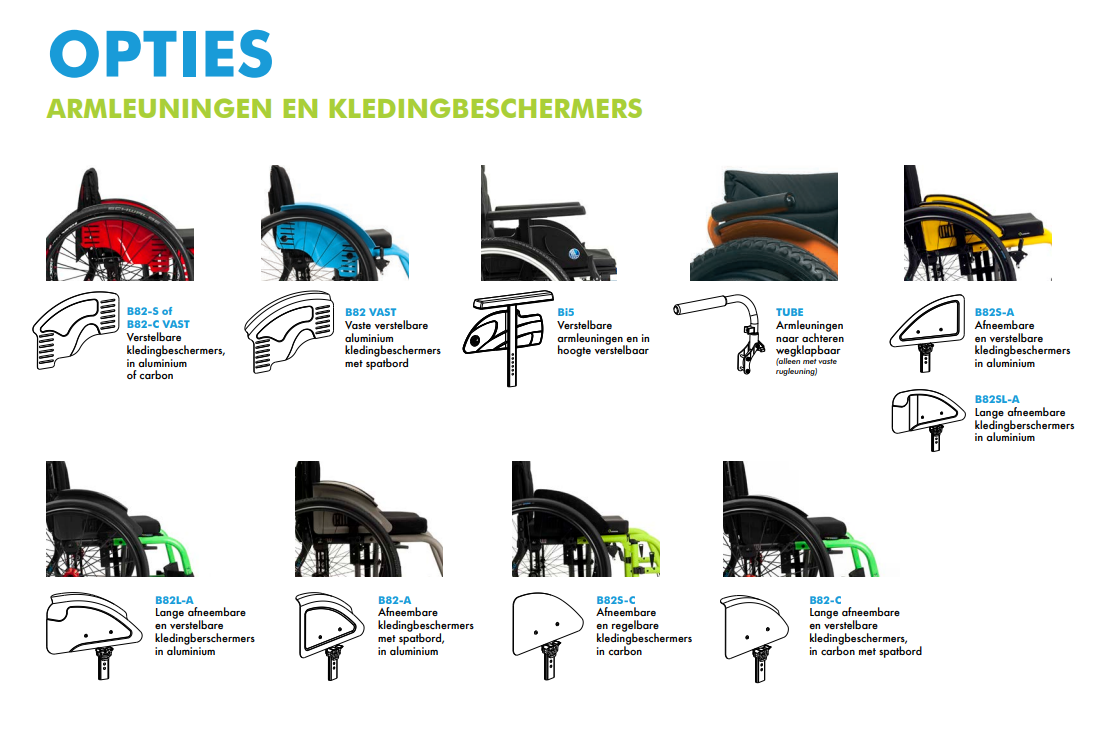 | Armsteunen Trigo | Kledingbeschermers - aluminium (B82S fixed) or Kledingbeschermers - carbon (B82S-C fixed) or Kledingbeschermers met spatbord - aluminium (B82 fixed) or Armsteunen - regelbaar in hoogte (Bi5) or Armleuningen (buis) naar achter wegklapbaar (enkel combineerbaar met vaste rugleuning - niet tezamen met L04) (BUIS) or Lange afneembare kledingbeschermers - aluminium (B82SL-A) or Afneembare kledingbeschermers - carbon (B82S-C) or Lange afneembare kledingbeschermers met spatbord - alu (B82L-A) or Afneembare kledingbeschermers met spatbord - carbon (B82-C) |