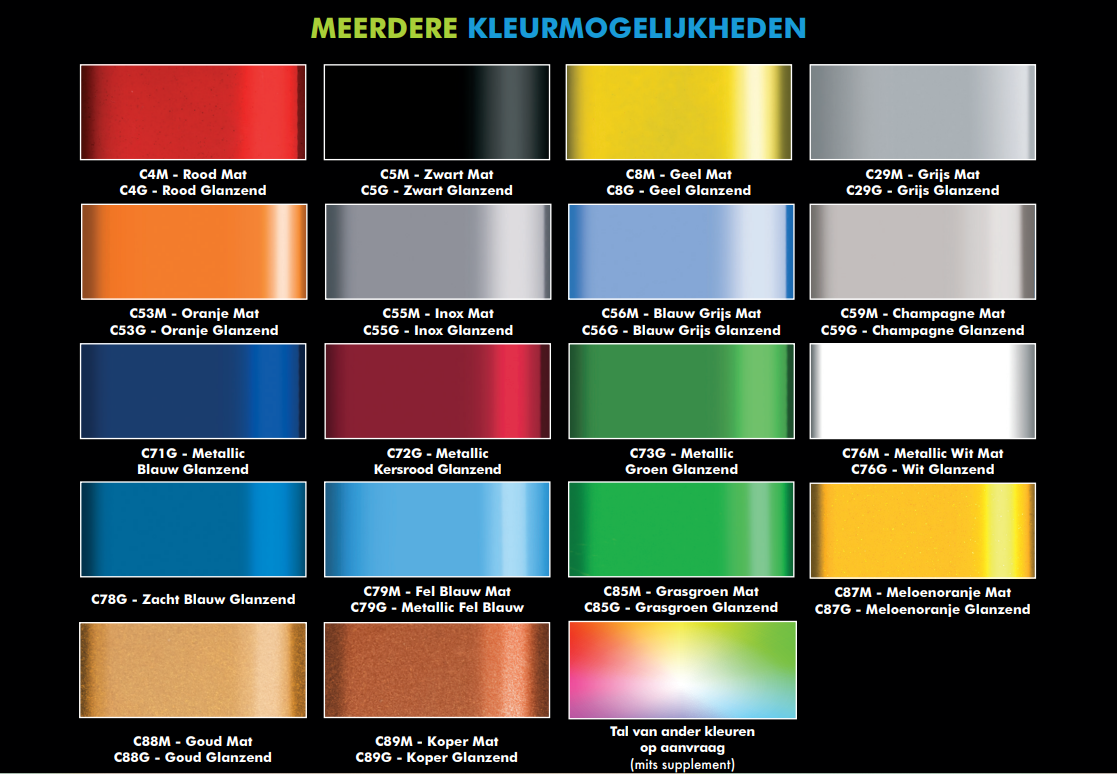 | Kleuren Kader Trigo | Rood mat or Rood gloss or Zwart mat or Zwart gloss or Geel mat or Geel gloss or Zilver mat or Ziver gloss or Oranje mat or Oranje gloss or Inox mat or Inox gloss or Blauw metallic gloss or Blauw metallic mat or Diepblauw metallic gloss or Kersrood metallic gloss or Groen metallic gloss or Wit mat or Wit gloss or Petroleumblauw metallic gloss or Zachtblauw mat or Zachtblauw gloss or Groen mat or Groen gloss or Meloenoranje mat or Meloenoranje gloss or Goud mat or Goud gloss or Koper mat or Koper gloss |